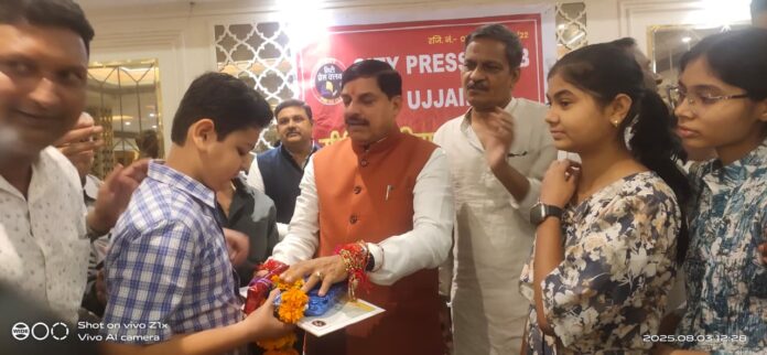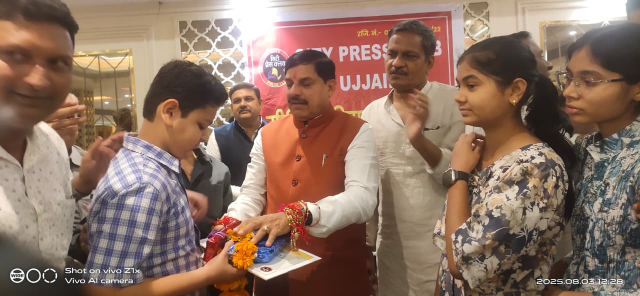 उज्जैन । सिटी प्रेस क्लब द्वारा आयोजित पत्रकारों के 50 से अधिक मेधावी बच्चों को मुख्यमंत्री डा. मोहन यादव सम्मानित किया तथा इस अवसर पर उज्ज्वल भविष्य की शुभकामनाएँ देते हुए कहा कि उज्जैन कृष्ण सुदामा की शिक्षा स्थली रही है तथा यहाँ अध्ययन का अलग महत्व है ।