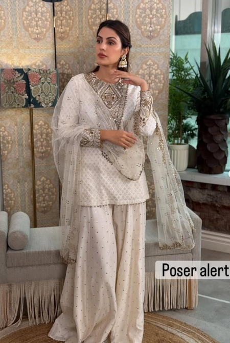 रिया ने वीडियो में दो अलग-अलग लुक दिखाए, जो एक-दूसरे से काफी अलग हैं। पहले लुक में वह पारंपरिक भारतीय पोशाक में दिख रही हैं, जिसमें सफेद रंग की खूबसूरत कढ़ाई वाला शरारा सूट और नेट का दुपट्टा है। इस पोशाक के साथ उनके मेकअप और बड़े झुमकों ने उन्हें रॉयल लुक दिया है। दूसरी तरफ, दूसरे लुक में रिया एक सॉफ्ट ग्रीन कलर की सिंगल शोल्डर ड्रेस में बेहद स्टाइलिश और मॉडर्न नजर आ रही हैं। उनके बालों को पीछे की तरफ बांधा हुआ है। उनके इस मॉडर्न लुक के साथ उन्होंने गोल्डन क्लच कैरी किया है, जो उनके लुक को और भी खास बना देता है।