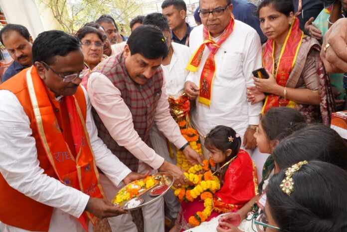 उज्जैन। नवरात्रि के अवसर पर मुख्यमंत्री डॉ. मोहन यादव रविवार को बी.डी. क्लॉथ मार्केट में आयोजित कन्या पूजन कार्यक्रम में सम्मिलित हुए। मुख्यमंत्री ने मातृ शक्ति के वंदन स्वरूप कन्याओं का पूजन कर आशीर्वाद लिया।