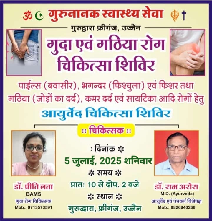 उज्जैन। गुरुनानक स्वास्थ सेवा द्वारा दिनांक 5 जुलाई शनिवार को स्थानीय गुरुद्वारा फ्रीगंज में प्रातः 10 से दोप 2 बजे तक एक विशेष चिकित्सा शिविर का आयोजन होगा जिसमें